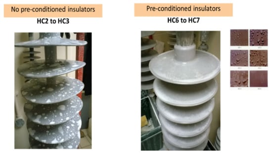 Before the application of the contaminant, the insulator was pre-conditioned with brushed dry kaolin, according to the Cigré WG C4.303 [] recommendation. This step was used for reducing the hydrophobicity of the insulator surface. Figure 4 shows an illustration of the effect of pre-conditioning on the HC index for non-textured insulators (conventional CONV). After one hour, 150 mL of contaminant was sprayed (uniform as soon as possible) along the insulator surface. Next, the insulators were left to dry vertically at ambient temperatures, during at least 24 h. The insulators were visually inspected after drying to confirm that the solid pollution layer was more-or-less uniformly formed. The geometrical parameters of the insulators are given in Table 2. Details about texture pattern and how to choose it are well-described in [,,]. The fog air pressure and flow rate were controlled by the external fog generation control panel, as described previously. We applied a light fog rate 3 L/h (light fog) that simulated the low humidification process.