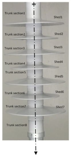 Figure 5 presents an example of used insulators for the present tests. The insulators are subdivided into 7 sheds and 8 trunk sections.