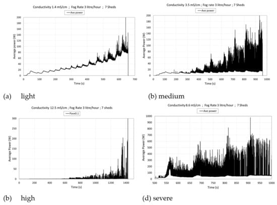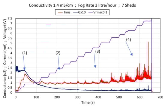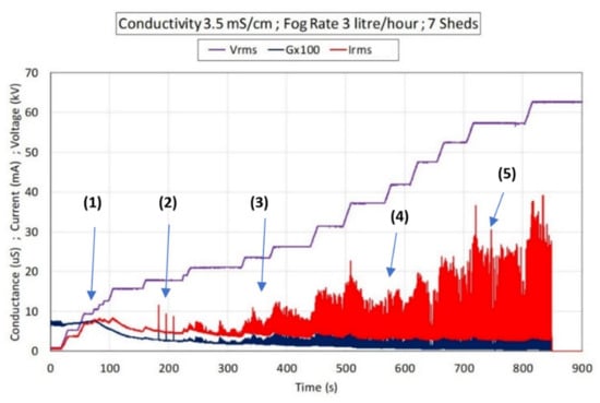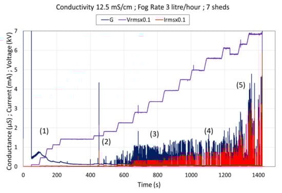 The testing position of the polluted SiR insulator was vertical, in order to be close to the suspension insulators in the overhead lines. The fog was applied simultaneously with the test voltage. The DAQ system monitored the LC, as the pollution layer absorbed moisture and became gradually conductive. The fog input rate should be sufficient to achieve the maximum value of layer conductance within 10–40 min of the fog application, according to the international standard IEC 60507 []. Low-voltage tests were performed to define the wetting duration, corresponding to the maximum SC of the pollution layer for each contamination degree. The test voltage was constant at 0.75 kV to 0.87 kV, which was the minimum voltage output of the power supply, and the retained fog rate was 3 L/h. The insulator was constantly monitored with the IR camera to detect any surface heating, in order to be sure that no drying of the pollution layer due to power dissipation, occurred during the low voltage test.