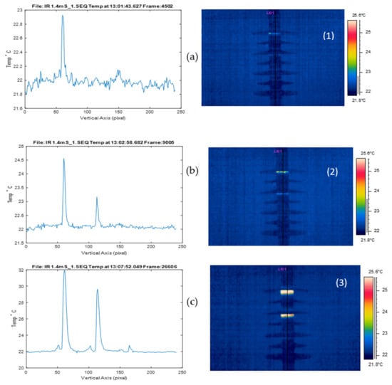 Thermal picture and temperature profile variation for light pollution. (a–c) are measured temperatures at the insulator surface. (1), (2) and (3) are the corresponding IR images.