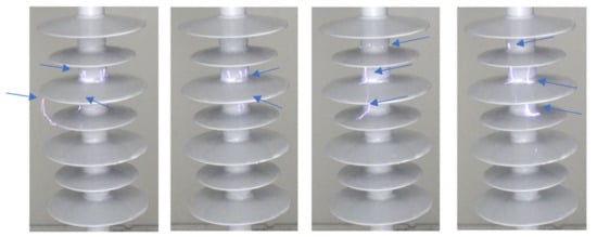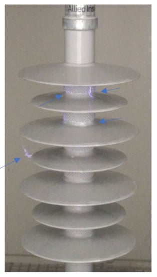 Figure 8 illustrates the DbD at the insulator surface contaminated with light pollution at the final step voltage (70 kV rms). DbDs were corona/streamers and spark, discharged with ramifications at their heads and purple/white color. Those discharges appeared at the junction between the trunk and the shed. Some discharges also appeared between the sheds due to the formation of the suspended droplets that could be assimilated as a conical electrode. The immediate consequence was that the air broke down between the droplet and the shed.