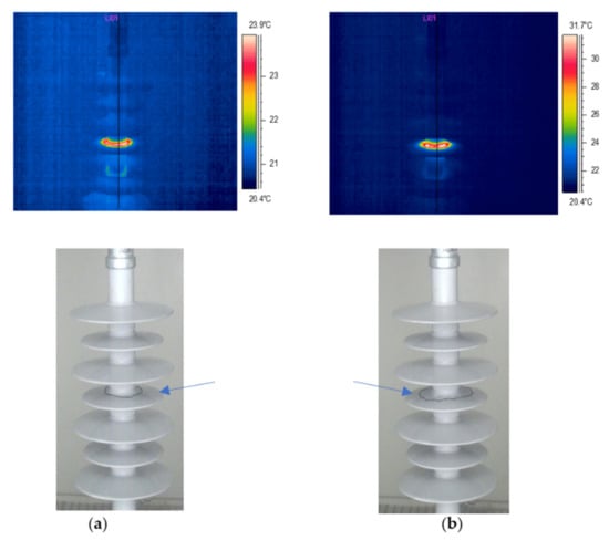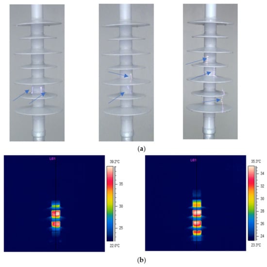 Figure 9 illustrates the records of LC and SC for all steps of a voltage ramp test, as shown for the light pollution level. At the first voltage steps just before 10 kV (noted (1) in Figure 9), the SC was maintained constant, while the LC increased with voltage, until approximatively 7 mA. At 8 kV, the SC and the LC collapsed, resulting in a local DB formation that dramatically increased the insulator surface resistance. Figure 10a,b illustrates the visual and the thermal records of the formation of the first DBs and their extension at the junction of the trunk and at the top of the fourth shed.