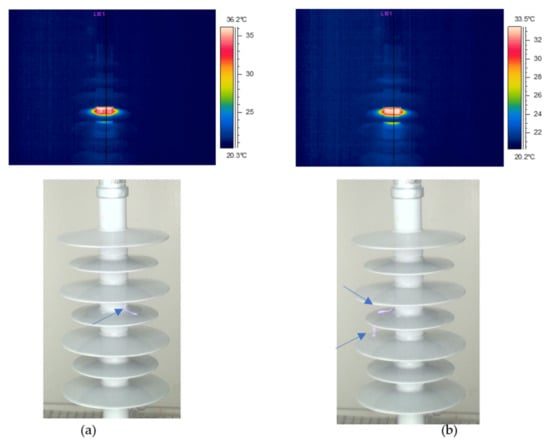 At 18 kV, the first DbDs appeared, corresponding to the first current pulses (noted (2) in Figure 9). With an increase in applied voltage, the LC activity was more intense (noted (3) in Figure 9), with a maximum value of 12 mA rms at 27 kV rms. The DbDs were spark discharged with purple/white coloration, as presented in Figure 11a,b. Above 30 kV, the DB activity was more intense, and the LC increased with the voltage. According to Figure 9, the LC in area (4) and (5) had typical values of dry-band arcs (DBPA) and a maximum LC growth up to 40 mA rms.