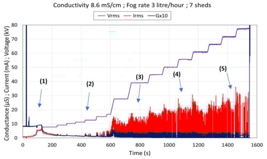 Surface conductance, leakage current, and applied free ramp voltage for medium pollution. (1), (2) (3), (4) and (5) are areas where LC activity and magnitude vary.