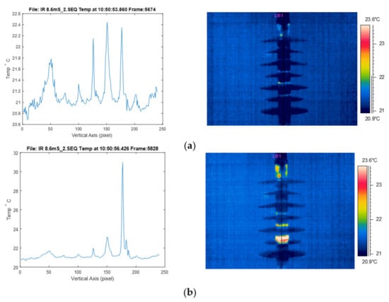 According to Figure 7b, the first dry-band was localized at the beginning of the trunk Section 2 (Figure 7b). This behavior continued with voltage increase, until step (3), corresponding to the first DbD activity. The DbD activity was more intense, and other DB appeared at the other trunk sections. Those DB were larger and more active, as shown in Figure 7c,d. The maximum recorded LC at this final step was 5 mA rms. The maximum temperature at the insulator surface corresponding to DB inception was close to 22.9 °C, while it was around 32 °C when the DBs extended.