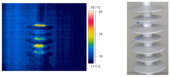 At 12 kV, the first DbD appeared corresponding to the first current pulses (noted (2) in Figure 10). With an increase in the applied voltage, the LC activity was more intense (noted (3) in Figure 10). The LC increased drastically at 17 kV rms with a maximum of 20 mA rms. Figure 13 and Figure 14 illustrate the thermal profile and the localization of the DbD activities and DB extension at the trunk sections of the insulator. We remark that the DB of trunk section number 6 extended and the temperature rose.