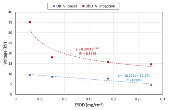 Based on previous measurements, the DB voltage onset and the DbD voltage inception were estimated and plotted as a function of ESDD. Figure 20 shows that both DB voltage onset and the DbD voltage inception decreased with the pollution level. This was attributed to the thermal dissipation of moisture from the pollution layer, which depended on its conductivity. When the conductivity increased, the current on the polluted surface was higher, and consequently, the Joule’s dissipation was higher. On the other hand, the DB voltage onset appeared to be linear with the pollution level. This was due to the ohmic behavior of the equivalent electrical circuit, which behaved as a linear resistor with joules effect and heating. The DbD voltage inception presented a different trend and was more likely to be a non-linear function. The main reasons were that the discharges inception depended on many factors, such as ionization process, DBs size, rewetting, and the evaporation process [] and the non-linearity of the discharge resistance [].