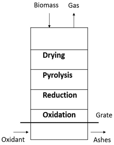 There are two types of gasifiers: fixed beds and circulating fluidized beds. The updraft gasifier is the oldest and simplest type of gasifier and is shown in Figure 1. In the gasification area, the solid charcoal from pyrolysis and tar cracking is partially oxidized by adding a flow of air or oxygen. Steam can also be supplemented to provide a higher level of hydrogen in gas production. The advantages of an updraft gasifier are given below [7]: