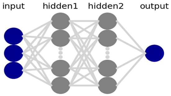 This paper adopted the Keras deep learning tool in the form of an application programming interface (API) in Python as a framework to define and train the neural network models. The coding process included preprocessing and the loading of data. Models were defined with a specified number of hidden layers in the neural network and their input and output sizes are included here. The loss function was defined accordingly, while the optimizer and the number of epochs were set to train the neural network and fit the model. An example of the ANN model structure is shown in Figure 3, including three input features, two hidden layers, and one output target. The number of hidden layers and neurons can be adjusted to minimize the error between the input and output data. These adjustments will affect the performance of the model.