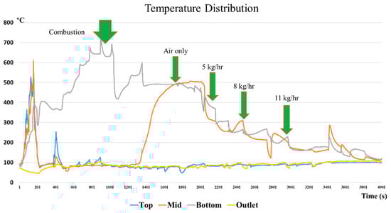 The temperature variations inside the gasifier were measured at four locations: the top, middle, bottom, and outlet of the gasifier. Typical variations of temperature inside the gasifier are presented in Figure 5. The green arrows represent the timing when the operating condition was changed during the gasification process. Rice husks should be burned with an external fire to start the process. The first green arrow is the completion time of the initial burning of rice husks. After the start period, the temperature at the bottom reached 700 °C. This is the level required to initiate the gasification process.