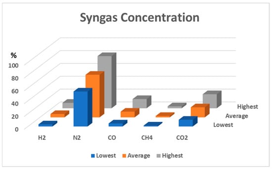 The syngas was collected after stabilizing the reactor temperature. Figure 6 presents the syngas compositions during the updraft gasification process when only air was used as the gasification agent. Several measurements were made for each gas. The concentrations of each gas are represented by three bars. The blue bars represent the minimum values of the measurements, the grey bars represent the maximum, and the red bars represent averages. On average, the syngas was composed of 5.2% H2, 8.8% CO, 2.1% CH4, and 15.6% CO2.