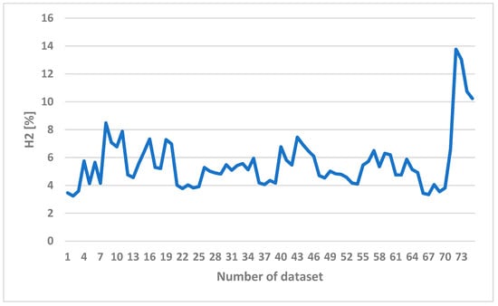 Since hydrogen is the most valuable component of syngas, the H2 contents of syngas obtained in the experiments with different operating conditions are therefore shown in Figure 7. The horizontal axis represents the number of a given dataset. A total of 74 sets of data were collected in the experiments. Each dataset is composed of three different operating conditions and five gas compositions. The operating conditions are listed in Table 2 including 11 levels of ER, 4 values of steam flow rate, and 44 levels of bottom-temperature. Without steam addition, the hydrogen content remains low. With steam addition, the hydrogen content rises up as shown in Figure 7.