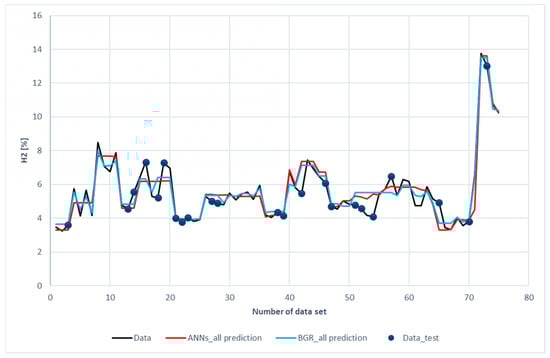 Figure 8 shows the comparison of H2 predictions with the experimental data. The blue dots scattered on the diagram represent the testing data chosen for both models. The data without blue dots denotes the training subset. The blue dots have been placed on the curve of experimental data to facilitate comparison between the prediction and experimental data. It was revealed that both the ANN and the GBR models, to a great extent, match with the experimental data for the training subset (without blue dots). This is consistent with the results shown in Table 6, in which the R2 for the training data is 0.93 for the ANN model and 0.97 for the GBR model; however, for the testing data represented with blue dots, deviations occurred between the prediction and measured data, especially for the ANN model with the 16th, 18th, 19th, 42nd, 52nd, 54th, 57th, and 65th datasets.