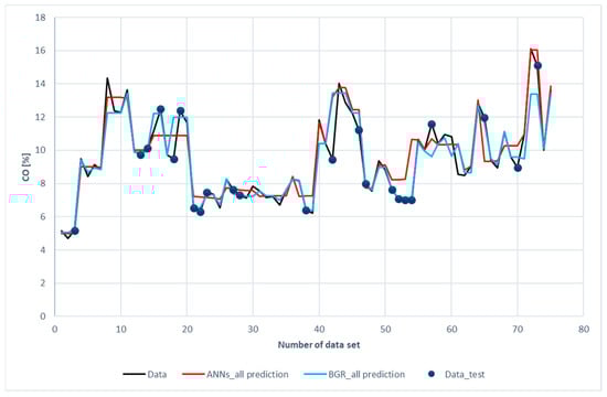 Comparison of CO compositions among the experimental data with the ANN and GBR models.