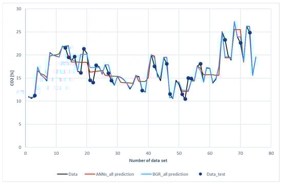 Figure 11 and Figure 12 show the comparison of CO2 predictions and N2 predictions with the experimental data of the ANN and GBR models. The same trends for performance are shown in these two figures as those for H2, CH4, and CO. It was revealed that both the ANN and the GBR models, to a great extent, matched with the experimental data for the training subset. For the testing data, the deviations in the GBR model were the same as the ANN model for CO2; however, the ANN model outperformed the GBR model in the case of N2. This is the only case where the ANN model recorded better performance than the GBR model in this study.