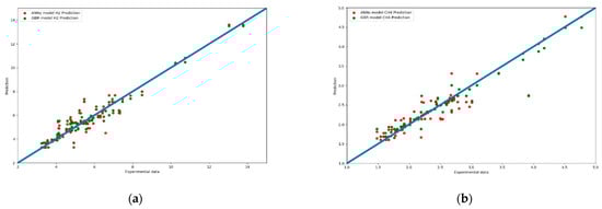 Figure 13a,b present another comparison for the performance of both models. The results of the prediction were compared with different color curves and scatter plots. A scatter plot is a graph of points that show the relationship between experimental and prediction data. It is a convenient way to present the correlation between two variables. H2 predictions for these two models are shown in Figure 13a. The results of the GBR model (green dots) are closer to the diagonal line than the ANN model. This echoes with the results shown in Figure 8.