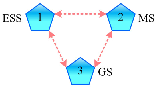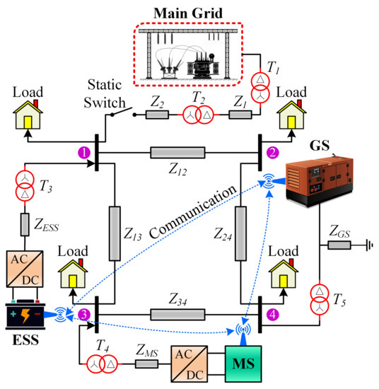 The correctness and effectiveness of the proposed control technique is evaluated by using a three-phase microgrid (MG) testbench, as illustrated in Figure 1. Note that the dotted arrows represent the undirected communication between the distributed generating (DG) units. The stated MG has three DG units and four buses. Two of the DG units are inverter-based (i.e., a microsource (MS) and an external energy storage system (ESS)). The third DG unit comprises an internal combustion (IC) engine operated diesel genset (GS) with a wound-field synchronous generator. The order of connection of the ESS, MS and GS to the buses, respectively, is 1, 3 and 4. All the DG units are connected to the buses through three-phase Y-transformers. At bus 1, the overall MG is connected to the main grid via a static transfer switch (STS). Between the DG units and buses, and denote the series coupling inductances, while represents a coupling capacitor. Various loads are attached to the buses. The lines between the main grid and bus 1 (, ) and between the buses (i.e., , , and ) represent -branches. The main grid and the entire MG testbench parameters are listed in Table A1–Table A4 in Appendix A. The undirected communication graph, , between DG units is illustrated in Figure 2.