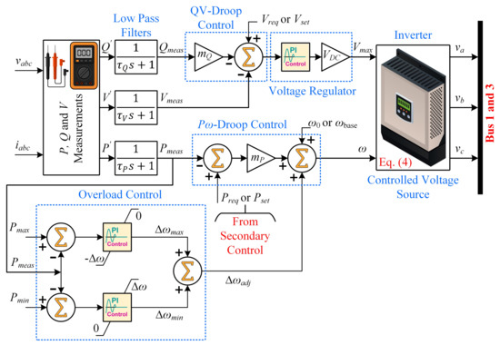 The inverter-based MS is shown in Figure 3, along with its droop/primary and overload control. For the MS, the -droop control is described as follows: