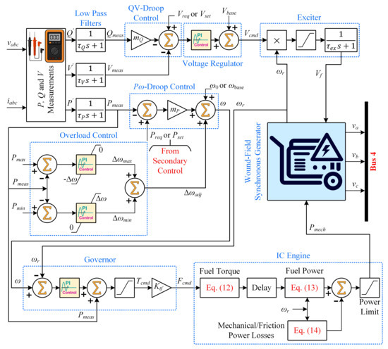 The main parts of the GS include a wound-field synchronous generator driven by a diesel IC engine, a mechanical speed governor and a field exciter. The overload control for the diesel GS can be applied in a similar manner to that applied to the inverter-based DG units, as shown in Figure 3.