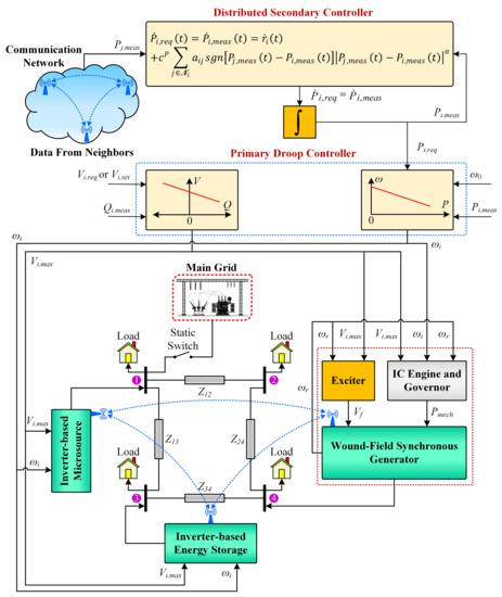 The proposed distributed control scheme is presented in this section. The main disadvantage of the droop/primary control is the steady-state, load-dependent deviations in the frequency of an individual DG unit during the autonomous operation of the MG; in other words, the primary control alone cannot nullify these frequency deviations. Thus, the design of secondary control, together with primary control, becomes essential for the frequency restoration of each DG unit to its nominal value during the autonomous operation of the MG [16,17,18]. The distributed control scheme incorporates the advantages of both centralized and decentralized control schemes [44], and is more robust and scalable [45]. For this purpose, the secondary control is designed with a slower execution rate and longer time frame than the primary control. This also justifies the individual design and decoupled dynamic analysis of the two control loops [19].