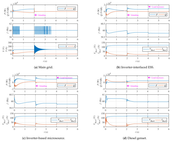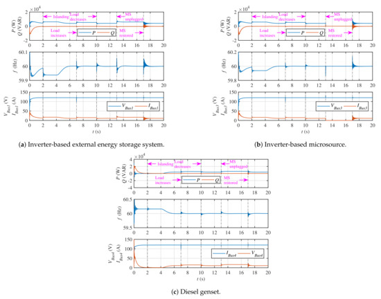Mathematically, the inverter-based MS is designed as a controlled-voltage source (three-phase), where its voltage magnitude, , and frequency, , at the terminals are controlled through external inputs. The inverter outputs are three-phase instantaneous voltages (i.e., , and ), as defined below [40]: