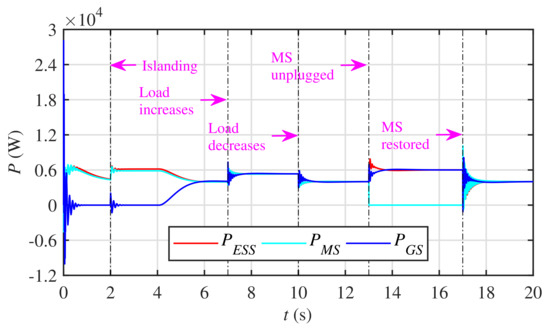 Since the upper PI controller is provided with a zero upper limit, it will be activated only if the MS real power output goes beyond . When the real power output goes beyond , then becomes negative and imposes the real power limit. The upper PI controller is also provided with a - lower limit to stop the real power output of the MS from going below . This strategy prevents the inverter-based MS frequency from sagging too much in the case of a sudden overload. This proceeds as follows: If the inverter-based MS is overloaded, it activates the upper PI controller, which immediately begins to reduce its frequency to prevent the overloading condition. On the other hand, to stop the real power output of the MS from going below , the lower PI controller is provided with a zero lower limit and upper limit. Thus, if the MS real power output goes below , then becomes positive and imposes the real power limit.