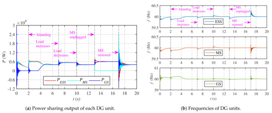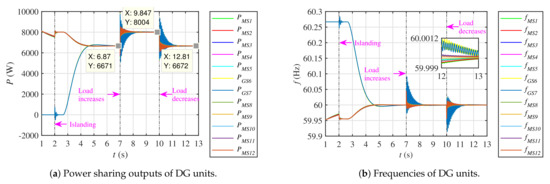 The proposed distributed controller, expressed in Equation (18), dictates the updated active power references, , to the droop/primary controller of each DG unit. In response to these commands from the distributed controller, each DG unit dispatches equal real power depending upon the average microgrid load (i.e., ) at that time. Concurrently, all the DG units are forced to operate with their frequencies regulated to the reference microgrid frequency. The overall closed-loop implementation of the proposed distributed secondary control protocol is depicted in Figure 5.