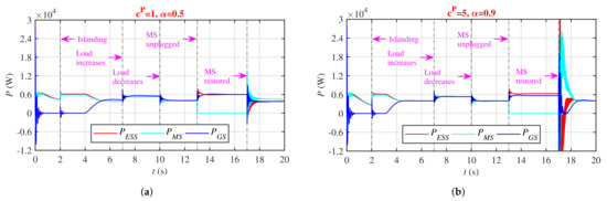 As with the inverter-based MS, the inverter-based ESS is also designed as a three-phase controlled-voltage source. Moreover, its droop/primary and overload control model almost resembles the mathematical model of the inverter-based MS, but with only one important dissimilarity: in the case of the ESS, the minimum limit of real power, , is kept negative—that is, pu—which indicates battery charging/energy storage. Thus, the -droop characteristic slope for ESS, , can be computed using the values listed in Table A3, in Appendix A, as follows: