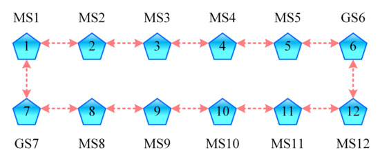 The concept of distributed control is based on the theory of the MAS, which considers an MG as a MAS, the energy nodes as vertices or agents and the communication links as arcs or edges. The information exchange/communication between various nodes takes place through a sparse communication system. The communication topology for a network of N nodes can be represented by a weighted graph, , whether directed (i.e., unidirectional) or undirected (i.e., bidirectional), where and and A are, respectively, the set of vertices, the set of edges and the weighted adjacency matrix. The elements of the set are denoted as , which denotes an edge leaving the ith node and arriving at the jth node and is shown by an arrow with its tail at the ith node and head at the jth node. This implies that information can flow from the ith node to the jth node. The jth node can be regarded as a neighbor of the ith node if . The weight of the edge is denoted by , where , if ; otherwise, it is 0. In other words, the edge can be considered as outgoing with respect to the ith node and incoming with respect to the jth node and, in this case, the ith node is termed as the parent and the jth node as the child. The number of edges with the ith node as a head is termed as the in-degree, , of the ith node, while the number of edges with the ith node as a tail is termed as the out-degree, , of the ith node. The neighboring set of nodes of the ith node is denoted by ; that is, the set of nodes with their edges arriving at the ith node. The number of neighbors of the ith node, , equals its in-degree, . If for all nodes, , the graph is termed as balanced. If , and , , the graph is termed as undirected; otherwise, it is termed as a digraph or directed graph. The ith node is said to be connected to the jth node if there exists a directed path from the ith node to the jth node. A digraph is termed as strongly connected if there is a directed path between every two distinct nodes. On the other hand, an undirected graph is termed as simply connected if there is an undirected path between every two distinct nodes.