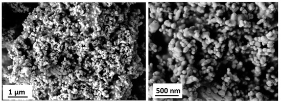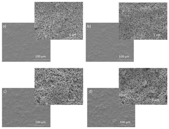 The layers produced after drying were treated at 450 °C for 10 min in reducing atmosphere in order to eliminate all the organics and obtain a well-consolidated electrode structure. The SEM images of the produced layers reported in Figure 5 shows homogeneous and crack-free films.
