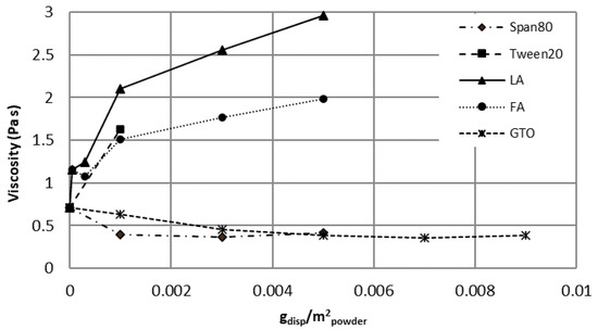 The ink compositions were studied starting from the amount and nature of deflocculant needed to produce stable terpineol-based slurries. The ink stability is in fact, strongly linked to the stability of the powder suspension. On the other hand, the stability of the suspension depends on the effectiveness of the coordination sphere around the particles [24] that can be improved using a deflocculant. The latter acts on the particles through one or two mechanisms eventually combined: electrostatic repulsion or steric stabilization [25,26]. Among the dispersants chosen, glycerol trioleate (GTO) and Span 80 have a prevailing steric effect; furoic acid (FA) shows mainly an electrostatic behavior; while lauric acid (LA) and Tween 20 show a combination of electrostatic and steric activity. Rheological tests on suspensions with the same powder concentration of the inks were selected in order to find the most effective dispersant for the CuO system [25,26]. Different dispersant amounts (g dispersant for m2 of powder) were tested in the range between 3 × 10−4 to 9 × 10−3 [27]. The values of the suspension viscosities were determined at a shear rate of 1 s−1, the value of shear to which an ink is typically subjected at the beginning of the printing process. The results, reported in Figure 2, show that the deflocculants that mainly or partially have an electrostatic action (LA, FA, and Tween 20) were not effective in stabilizing the system. On the other hand, the viscosity of the suspensions decreases when deflocculants with steric behaviour (GTO and Span 80) were added. Among the different concentrations tested for these two systems, 7 × 10−3 g/m2 GTO gave the best stabilization and was therefore considered as deflocculant for the CuO inks.