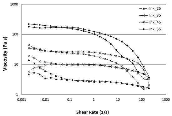 The flow curves of the four inks are presented in Figure 3. These data show a typical pseudoplastic behaviour for all the formulations with viscosity suitable for the screen-printing process [17]. Particularly, the polymeric network is more structured for higher binder contents, as shown by the increase in inks viscosity passing from ink_25 to ink_55.