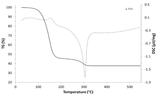 The TG–DSC analysis of one of the inks produced is reported, as example, in Figure 4. This analysis shows two main weight losses at about 150 and 300 °C, due to the solvent evaporation and organics removal, respectively. The analyses of inks with different compositions, differing just on the amount of employed organics and therefore on the weight loss on the TG curve, are not here presented.