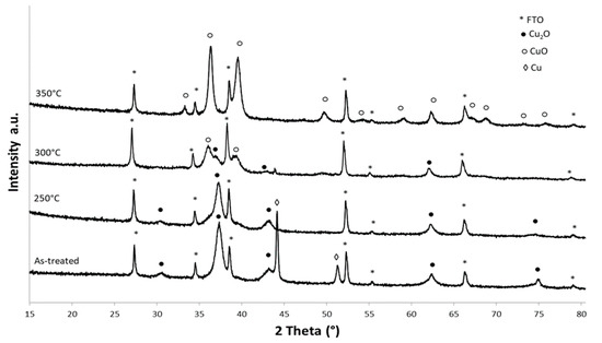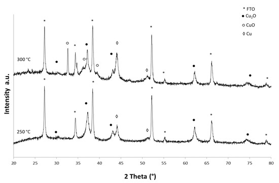 Figure 6a, corresponding to ink_25, shows a surface densely covered by sharp particle agglomerates, while an increase in the binder amount (Figure 6b), generates a less defective area. Since the performances can change significantly with the electrodes’ microstructures [18,29], the samples produced with compositions containing the higher and the lower amount of binder (ink_25 and ink_55), were selected for the functional analyses. These electrodes showed the higher difference in porosity (48 ± 3 vol.% for ink_25 and 56 ± 2 vol.% for ink_55) and surface roughness (Table 2). To compare the results obtained, the layers were produced with similar final thicknesses: 2.10 ± 0.73 and 2.29 ± 0.66 μm for ink_25 and ink_55, respectively. After the thermal treatment in reducing atmosphere, the XRD results of Figure 7 show the presence of Cu2O (JCPDS 05-0667) and Cu (JCPDS 3-065-9026) in the electrodic layer. In literature it is reported [30] that the reduction of Cu follows the path: CuO→Cu2O→Cu. The presence of different species is therefore related to strength of the reduction process. To increase the amount of Cu(I), one of the most promising photocatalysts for the conversion with visible light [9], the layers produced were oxidized using further thermal treatments in air (with dwelling time of 30 min). The annealed electrodes showed changes in film composition, as reported in the XRD spectra of Figure 7. The nature of the phases present changed with temperature, increasing the percentage of the oxidized copper forms, following this oxidation path Cu→Cu2O→CuO. Cu2O (JCPDS 05-0667) is present at 250 °C, at 350 °C CuO (JCPDS 48-1548) is the only phase present, while the treatment at 300 °C (medium temperature) shows the coexistence of Cu2O/CuO. The films treated at 250 (Cu2O) and 300 °C (Cu2O/CuO) were then selected for the functional characterizations. It is worth remembering that a mixture of Cu2O and CuO could assure good photocatalytic properties as well as sufficient stability against photocorrosion.