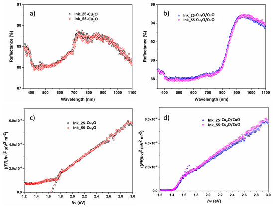 UV–Vis diffuse reflectance spectra of films produced with Cu2O-based ink (a) and Cu2O/CuO-based ink (b), and related Tauc plots for Cu2O-based ink (c) and Cu2O/CuO-based ink (d).