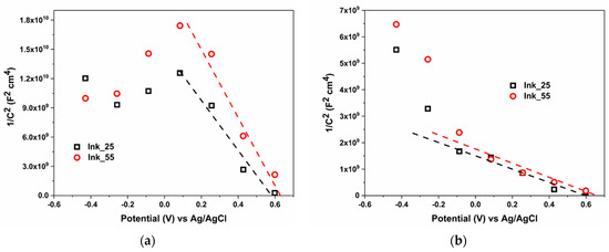 Table 3 shows comparable bandgap values for Cu2O and Cu2O/CuO-based films, respectively. The obtained results are in good agreement with the ones reported in literature [23,32]. For the Cu2O/CuO-based layers, the bandgap values decrease compared with the layers of Cu2O, due to the combination of the different copper phases produced by the different thermal treatments that finally extends the light adsorption range. The ability of Cu2O/CuO to harvest photons with higher energy can improve the hydrogen production when this electrode is used as a photocathode in PEC, as reported by P. Diao et al. [23]. The electronic properties of the screen-printed films were determined using equation 2. The obtained Mott–Schottky plots are reported in Figure 9 and the flat-band potential (Efb) and number of donors (NA) are reported in Table 3.