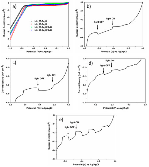 (a) Linear sweep voltammetry in light/dark conditions in a wide potential range, (b) magnification in the low potential range for films based on ink_25–Cu2O, (c) ink_55–Cu2O, (d) ink_25–Cu2O/CuO, and (e) ink_55–Cu2O/CuO.