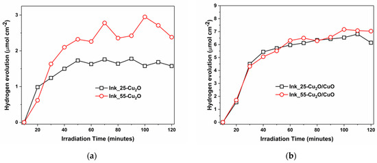 Figure 11 shows that hydrogen production increased linearly with reaction time up to 40 min for both the tested photoelectrodes. Different reaction rates were observed for CuO and Cu2O/CuO samples and this behavior could be linked to in situ catalyst activation, due to the reduction to metal copper that finally enhances the electronic acceptor capacity [37,38].