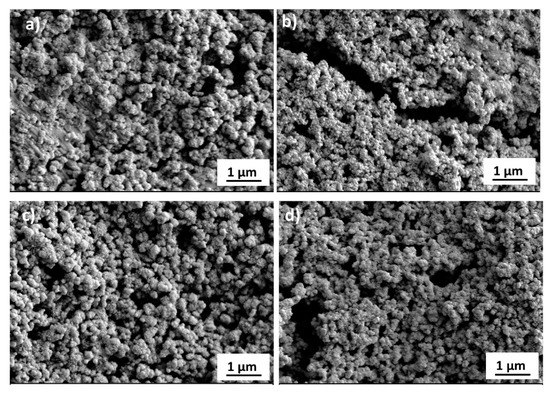 SEM images of the surfaces of the electrodes produced using (a) ink_25, (b) ink_35, (c) ink_45, and (d) ink_55.