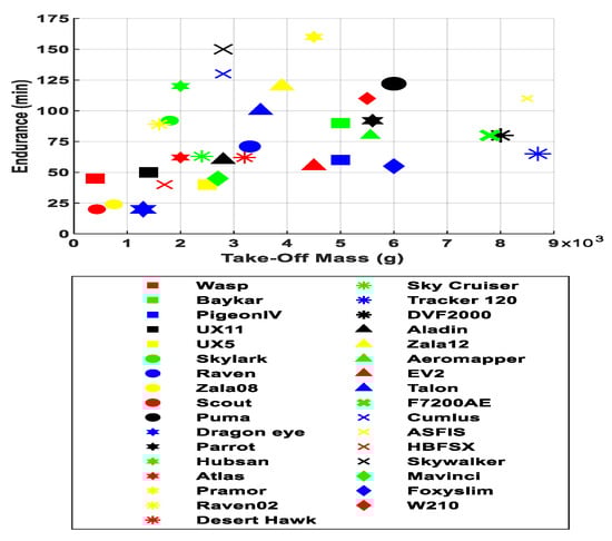 Hand launched unmanned aerial vehicles are considered to be a good choice for small scale UAVs designed for long endurance flight missions as they have many advantages over other types of MUAVs [8,9,10]. First, hand launched UAVs do not require runways or mechanical launching aids. Second, they require less training and less setup time. Third, they can have longer endurance because they require less power for take-off during flight missions. Figure 1 shows a sample of the most popular MUAVs in which endurance versus take-off mass is shown. It can be concluded from Figure 1 that more endurance requires more take-off mass. Improving MUAVs performance characteristics requires a combination of reducing the take-off mass and increasing the flight duration.