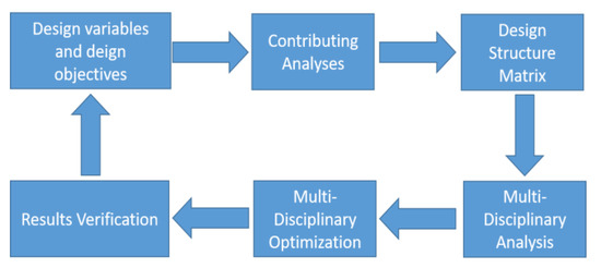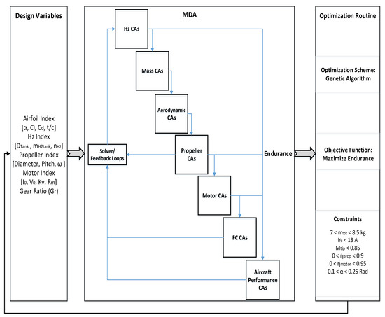 Aircraft design consists of subsystems which are described as multi-disciplinary complex systems by nature such as fuel cell and propeller subsystems. This requires simplifications and decomposition schemes to provide a well-structured method for analyzing the MDA which are done in the preliminary design stage. Figure 2 illustrates the process of obtaining a logical MDA for aircraft design. First, different design variables and objectives should be defined. These design variables are modeled in their contribution analyses. A design structure matrix is needed for managing the flow of information among different contributing analyses. DSM should be fitted into MDA framework solution scheme that guarantees that all design objectives are met. MDA flexible framework includes compatibility equations and nonlinear solvers. So, the preliminary design level allows for in depth analysis for the baseline UAV defined in the conceptual design. In addition, all powertrain components are modeled in this stage.