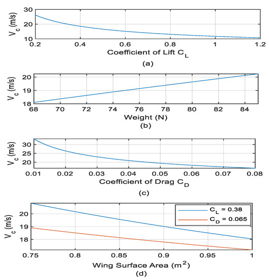 Parametric Study for UAV Cruise Speed versus: (a) Coefficient of Lift. (b) UAV Weight. (c) Coefficient of Drag (d) Wing Surface Area.