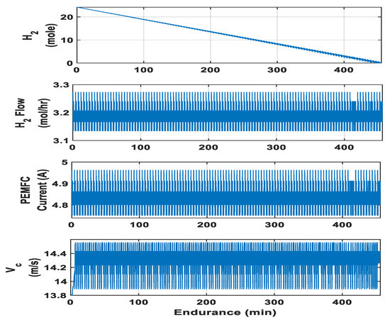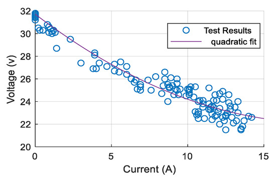 The fuel cell model consists of three main parts; fuel cell output voltage, fuel cell hydrogen consumption and fuel cell oxygen consumption. PEMFC output voltage is represented by its polarization curve obtained experimentally by connecting the PEMFC to the load directly and operated until it reaches its full output power [26] as shown in Figure 4. Hydrogen consumption can be calculated from Faraday’s law [27]: