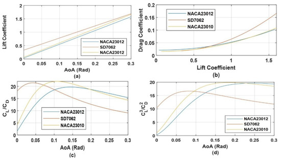 The aerodynamic simulation for the proposed aircraft was done using XFLR5 for a range of angle of attacks at a fixed Reynold number of 400,000 as shown in Figure 7. The resulted relations of the coefficients of lift and drag at an angle of for three low speed airfoils; NACA23010, SD7062, NACA 23012 are as follows: