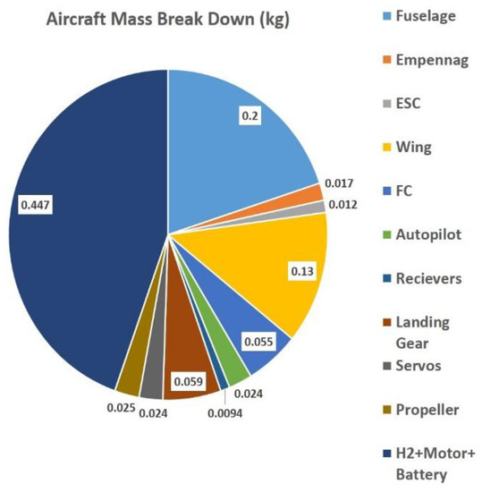 The aircraft weight breakdown consists of two main parts. The first part includes the UAV fixed masses which are the airframe that includes the fuselage weight, wing and tail weight, PEMFC weight and landing gear weight. While the second part includes the components that needs to be specified which are the hydrogen tank mass, hydrogen content mass, electric motor mass and propeller mass. Those components correspond to 44.7% of the total UAV weight as shown in Figure 9.