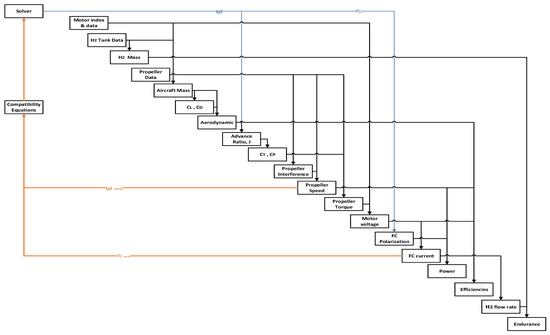 The resulted MDA is shown in Figure 11. The solver variables are the fuel cell current and propeller speed. These variables are set to some initial values. As the analysis begins. The new resulted variable values are fed back through the loop to the MDA again.