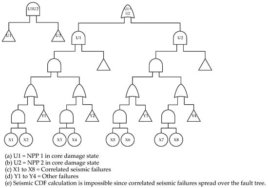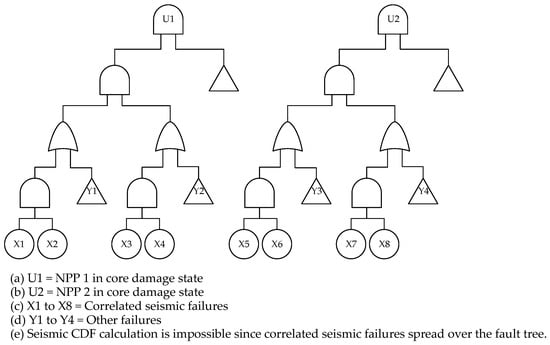 In this study, two seismic SUPSA fault trees are connected by an AND gate and an OR gate to calculate the MUCDF and SCDF, respectively. Each seismic SUPSA fault tree in Figure 1 has four correlated seismic failures of redundant/identical components (X1 to X4 for U1 and X5 to X8 for U2), which exist under the two AND gates. The seismic MUPSA fault tree in Figure 2 has eight correlated seismic failures (X1 to X8). Since there is no fault tree simplification in Figure 1 and Figure 2 by the assumption of the full correlation among seismic failures, best-estimate SUCDF and MUCDF are calculated by the fault trees in Figure 1 and Figure 2 following the calculation procedure in Section 3.