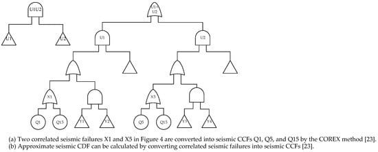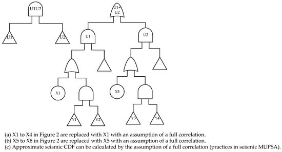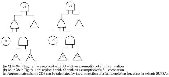 Simplified fault trees such as that in Figure 3 are combined into SCDF and MUCDF fault trees in Figure 4. As shown in Equation (3), if the full correlation assumption is applied to correlated seismic failures that are under an AND gate, the AND gate probability is maximized. As shown in Figure 4, the seismic events X1 and X5 are combined with an AND gate at the top level for MUCDF. If the full correlation assumption is applied to X1 and X5, the conservative MUCDF can be calculated if the full correlation assumption is applied to X1 and X5.