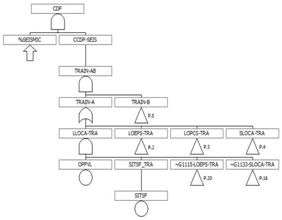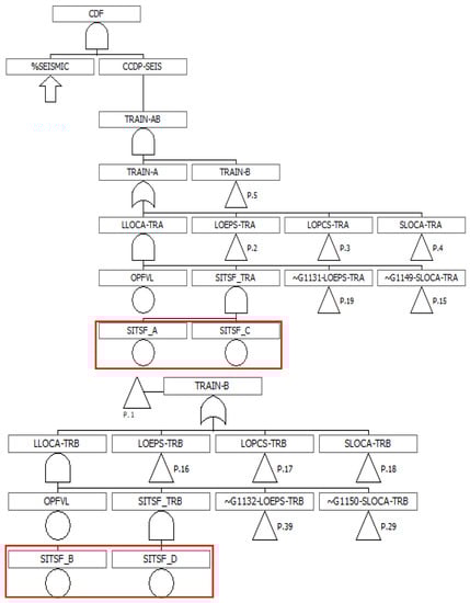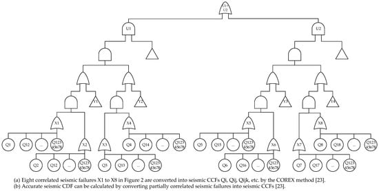 Then, as explained in Figure 5 and Figure 6, the seismic failures (, , …, ) are converted into OR gates that have corresponding seismic CCFs (, , , …), as shown in Equation (7). In other words, all the correlated seismic failures in the fault trees of Figure 8, Figure 9, Figure 10 and Figure 11 are converted into OR gates that have corresponding seismic CCFs.