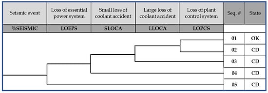 In Table 6, all the event names are abbreviated from the names of components and failure mode. The seismic failure events used in this study are as follows: Emergency Diesel Generator Seismic Failure (EDGSF), Middle-Voltage (4.16 kV) Structural Seismic Failure (MVSSF), Middle-Voltage Functional Seismic Failure (MVFSF), Low-Voltage Structural Seismic Failure (LVSSF), Low-Voltage Functional Seismic Failure (LVFSF), Motor Control Center Seismic Failure (MCCSF), DC Control Center Seismic Failure (DCCSF), Battery Charger Seismic Failure (BCHSF), Safety Injection Tank Seismic Failure (SITSF), Inverter Feature Seismic Failure (INFSF), and Instrumentation Tube Seismic Failure (INTSF).